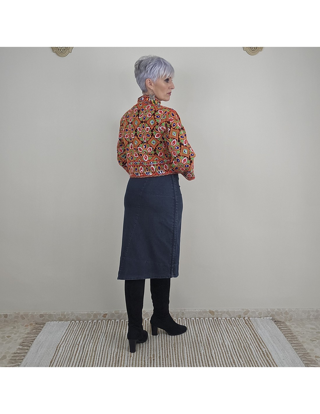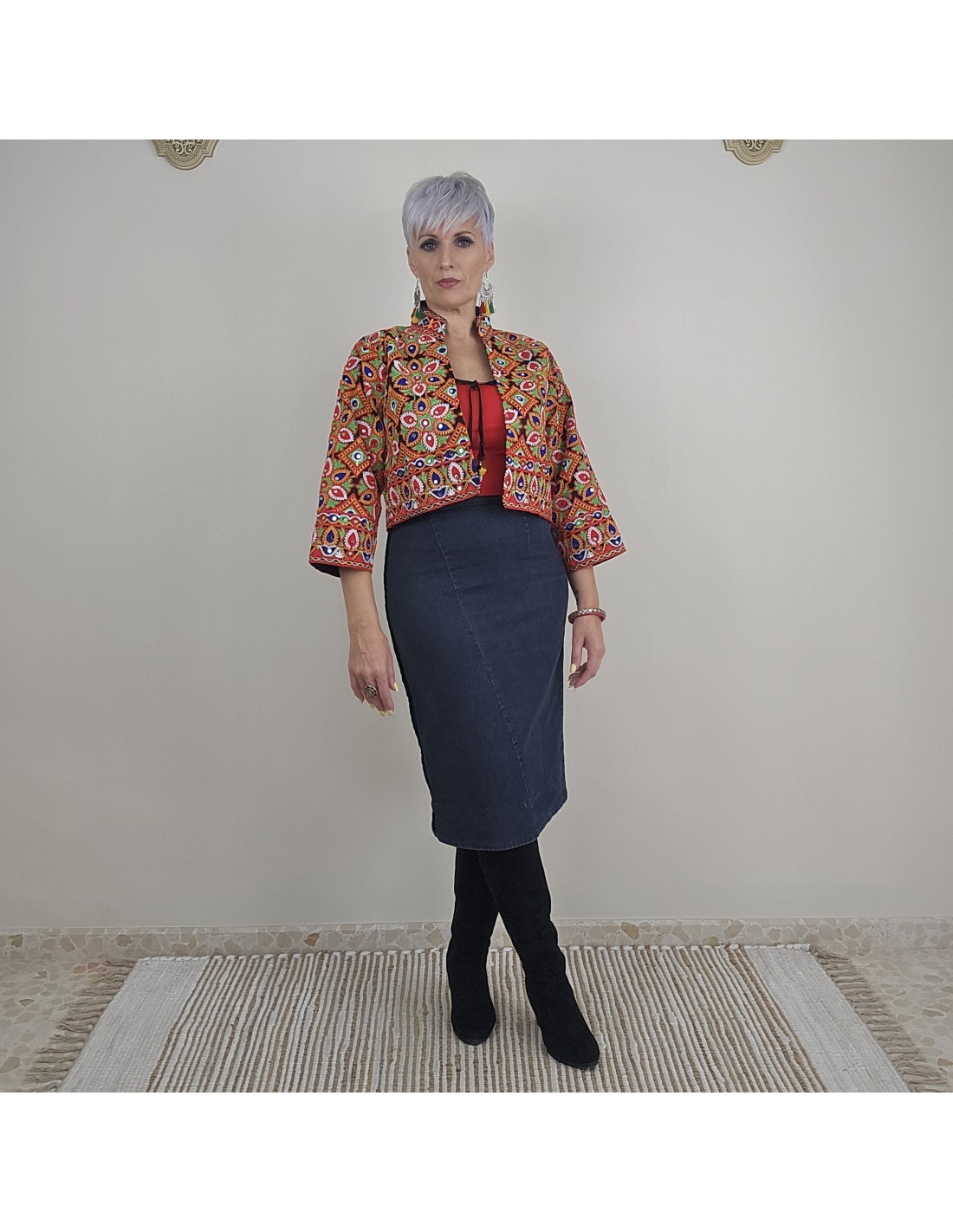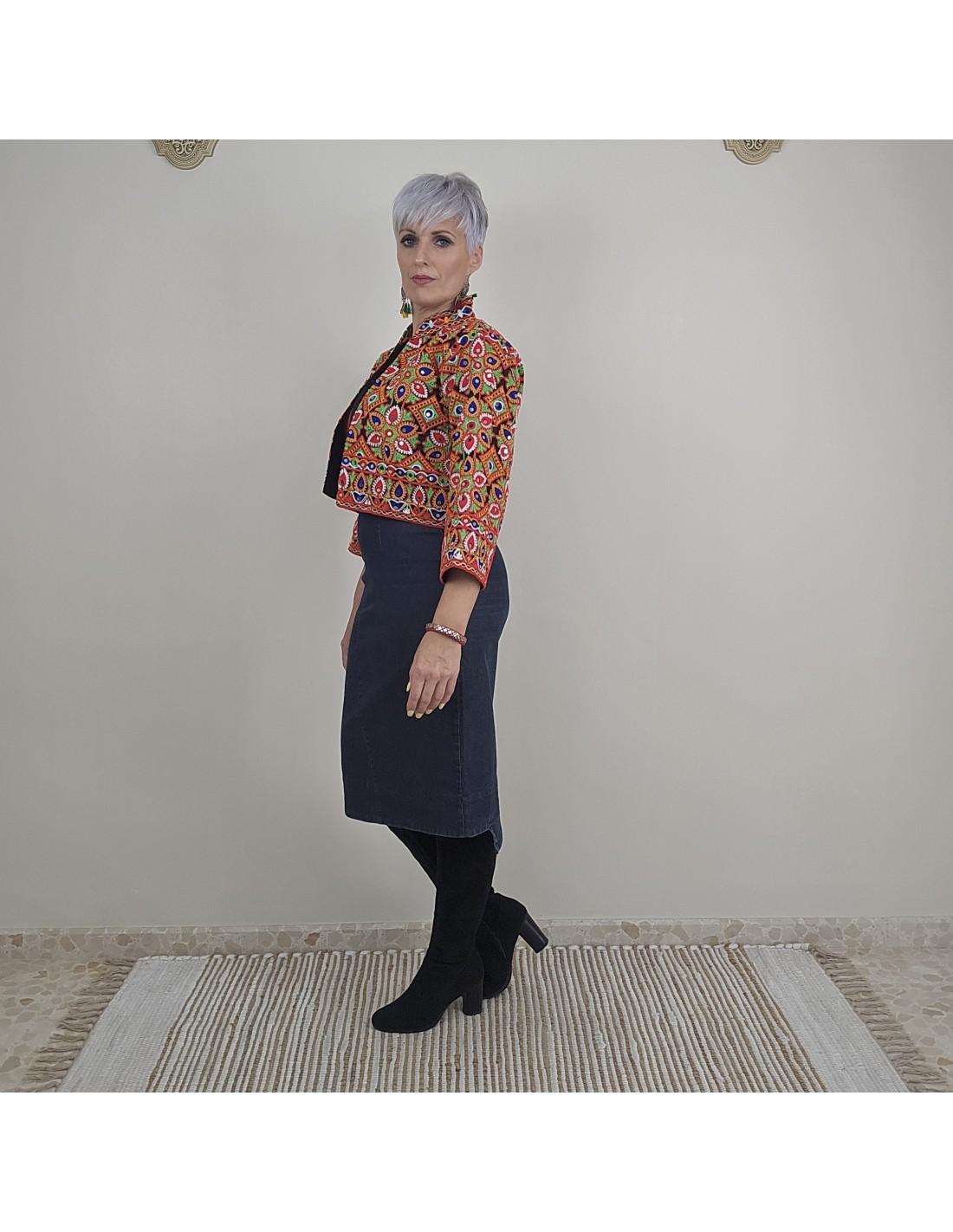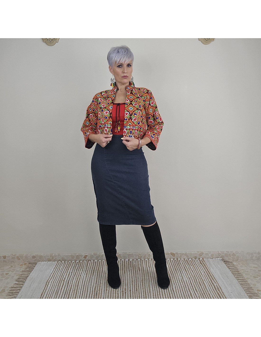 Talla: Única / Origen: India / Material: Algodón , rayón y retales Saree / Técnica: Bordado a mano / Diseño: Chaqueta torera de inspiración étnica