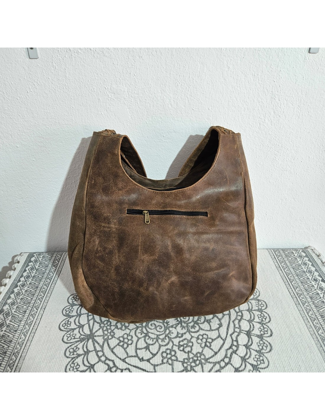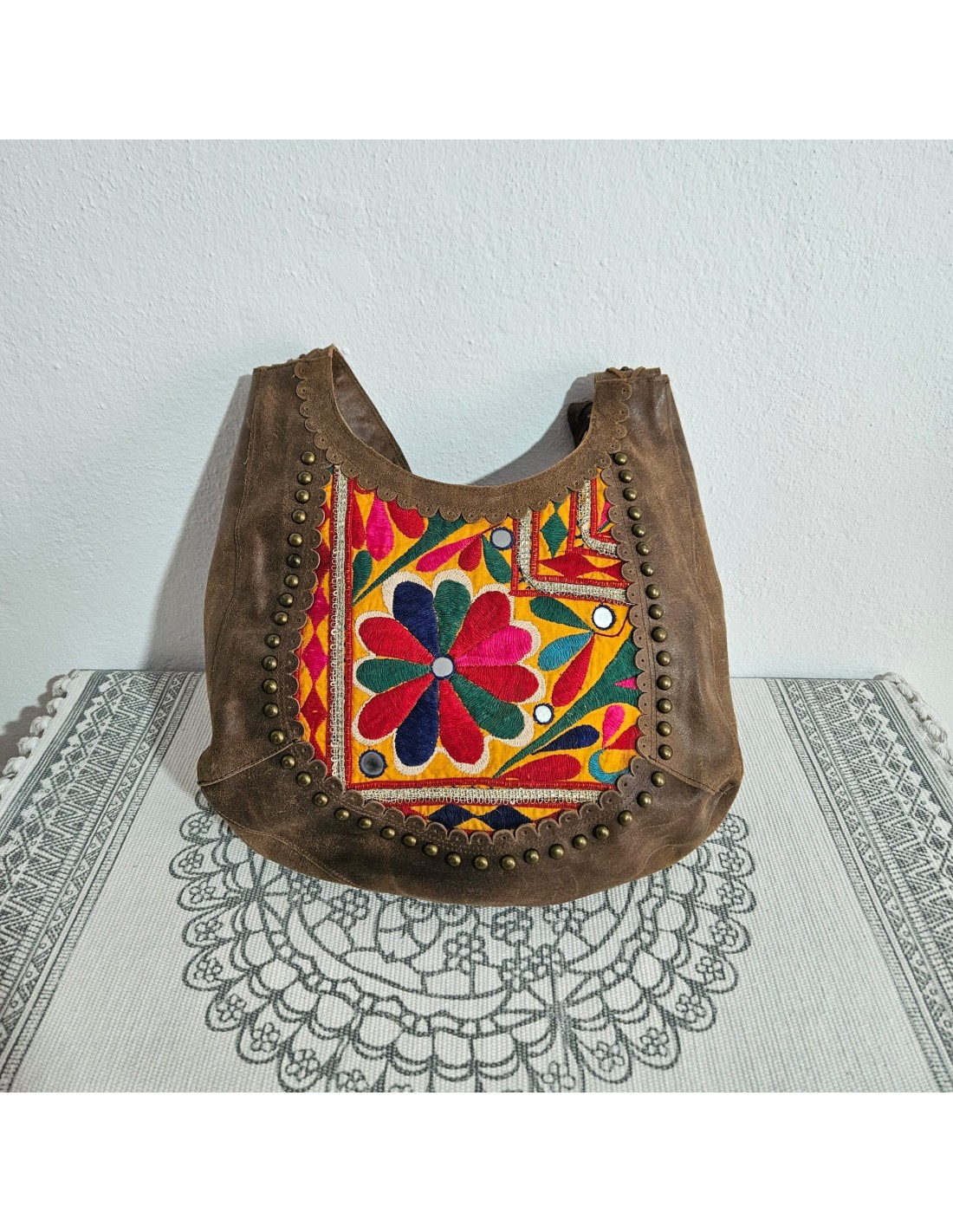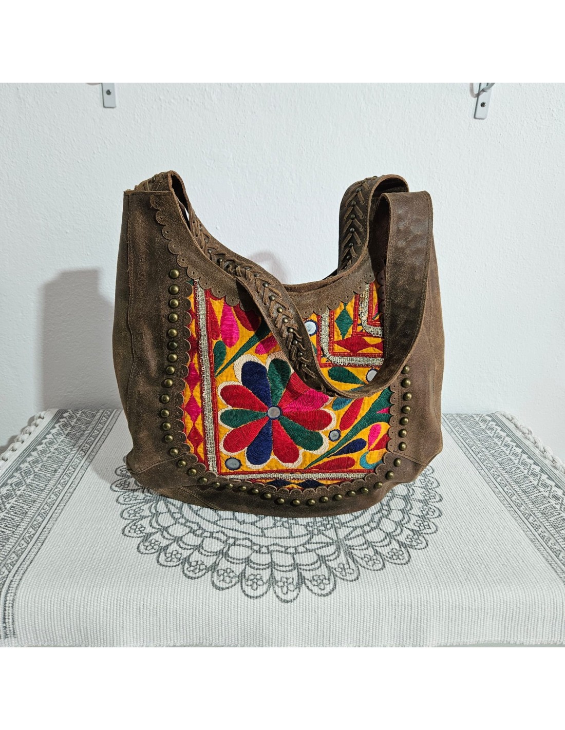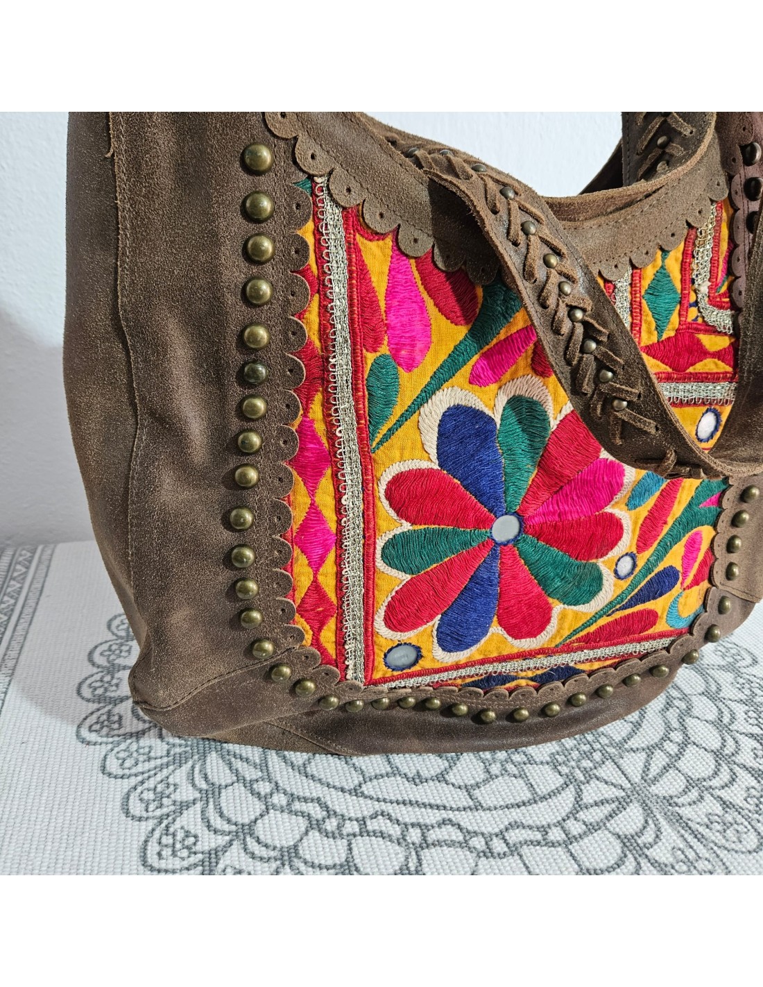 Medidas: 40x55 cm aprox. | Material: Retales de tejidos y piel con efecto aceitado | Ajuste: 1 asa ancha, cierre con cremallera | Diseño: Círculo bordado y tejidos banjara | Detalles: Tachuelas y bordados únicos