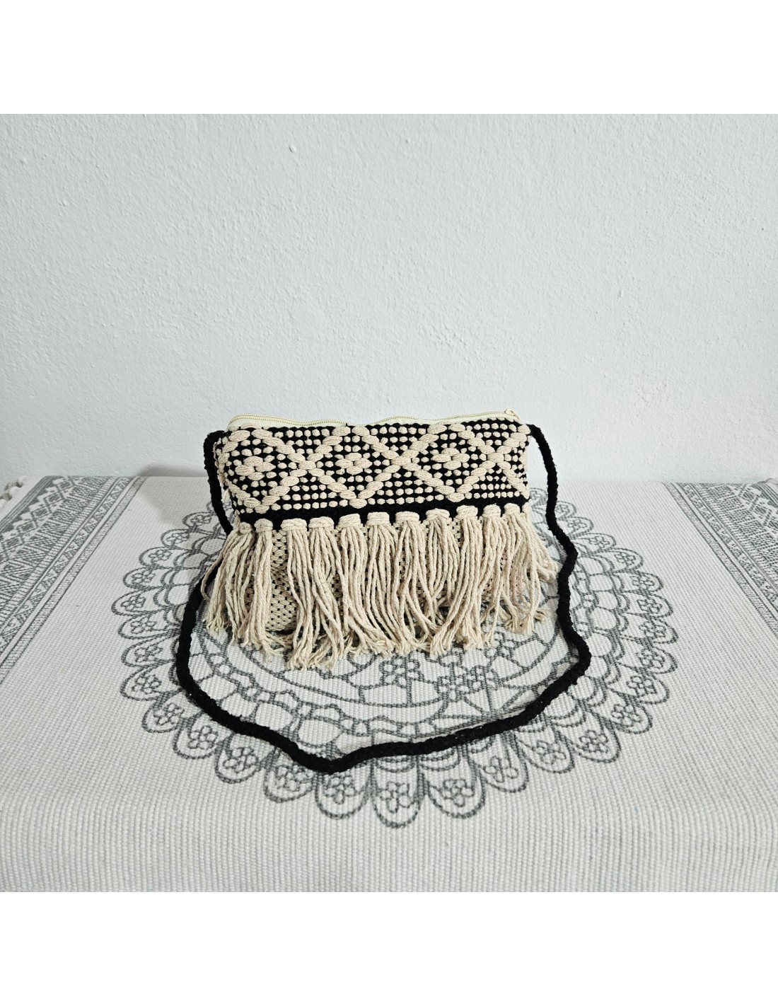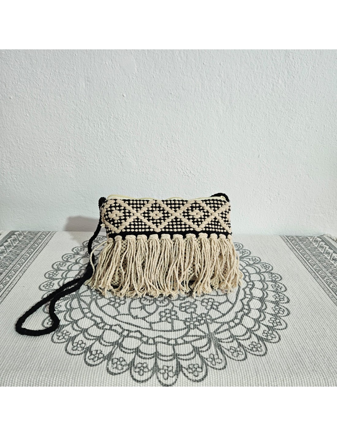 Un bolso con alma bohemia y detalles que enamoran a primera vista. Elaborado en algodón y destaca por su forma creada a través de entrelazados de hilos muy original. Sus flecos le dan movimiento y estilo combinado. Es un accesorio especial que marca la diferencia en múltiples looks. Puede ir muy bien como bolso de mano o para complementar un outfit más relajado.