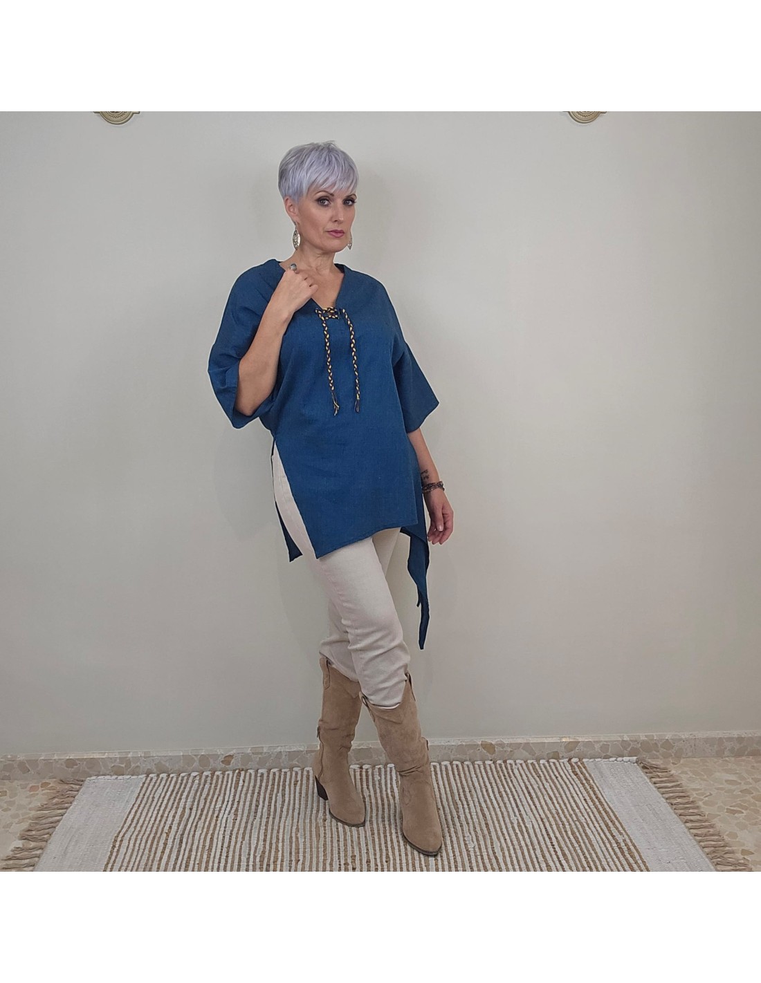 Talla: Única | Origen: India | Material: Algodón natural | Técnica: Hecho a mano | Ajuste: Escote en pico ajustable con cordón, mangas 3/4 y corte asimétrico