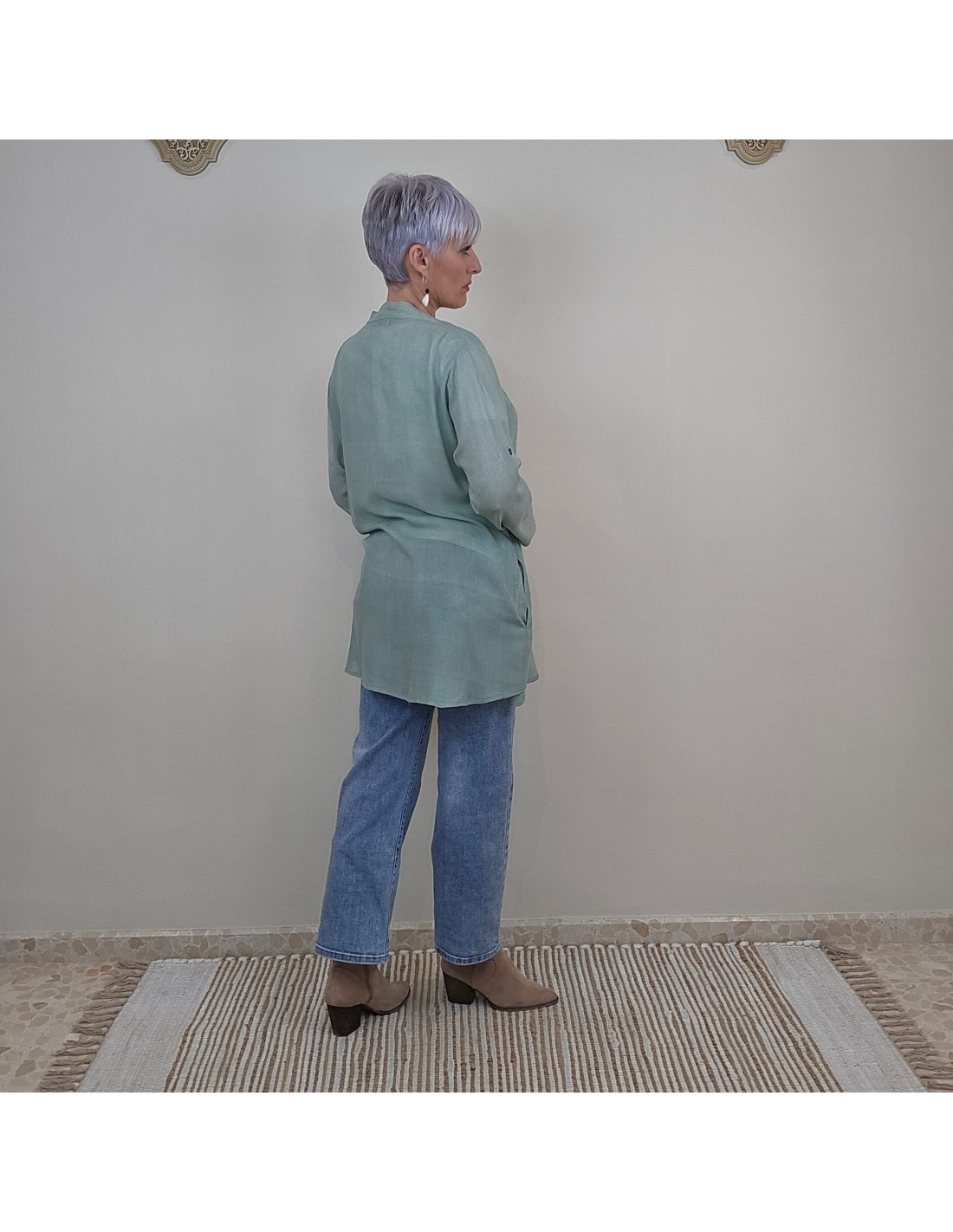 La camisa esta elaborada en rayón , tiene una caída suave y un diseño amplio que aporta movimiento y estílo , con mangas largas , botones frontales y prácticos bolsillos ,