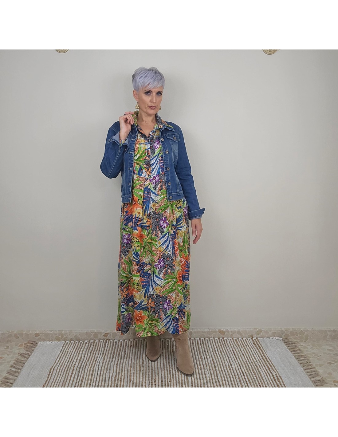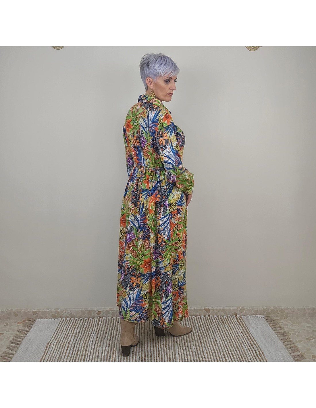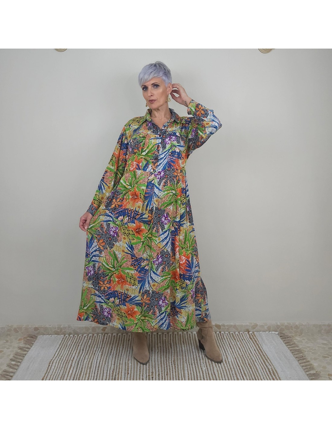 Vestido camisero largo en rayón con estampado artesanal. Ligero, cómodo y exclusivo, ideal para un look fresco y femenino.